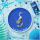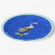 Parfait pour une fête dans le jardin. Un canard en bois peint et sculpté avec son canard, lourdement patiné, sur un arrière - plan bleu. Ajoutez votre propre texte.