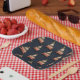 Plaque de papier carré moderne avec un arrière - plan bleu minuit et motif de sapin de Noël en rouge et vert. Idéal pour les snacks ou les desserts. Complète les grandes assiettes carré et rondes pour une collection de vaisselle de vacances.