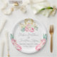 Cette assiette de mariage personnalisée a un thème de conte de fées avec des fleurs roses et blanches. Aquarelle roses blanches et pivoines roses accentuent les coins inférieurs. Un chariot de princesse Cendrillon en or est placé au sommet.