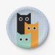 Plaques en papier adorables avec trois chats drôles. L'une est noire, à gauche du design, l'autre est orange, légèrement en bas et à droite du chat noir, légèrement devant et l'autre est turquoise, en bas des deux autres chats et debout devant eux. Le seul trait sur les chats est les grands yeux ronds. L'arrière - plan des assiettes est un joli motif bleu pastel en vichy.
