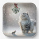 Un chat moelleux et un regard de souris minuscule face à une bande de faux-pied ornée d'un arc rouge tandis que des flocons de neige se glissent autour d'eux