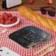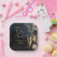Stylish New Year's Eve party square paper plates feature a champagne glass, clocks, confetti and fireworks on a midnight blue background with your party details in chic lettering. MATCHING items in our collection.