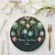 Elegant Christmas holiday deep green paper plates feature pine branches, green and gold Christmas ball ornaments and red ribbons with Merry Christmas and your name in chic lettering, perfect for your festive holiday gathering. MATCHING items in our collection.