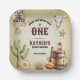 Saddle up et décorer pour une fête de premier anniversaire de cowboy à l'occidentale amusante. Un arrière - plan de parchemin patiné présente les éléments d'une fête d'anniversaire de rodéo parfaite, y compris un cactus, une guitare, une roue de wagon, des algues et bien plus encore ! Des ornements de style occidental décorent la plaque de papier pour créer un thème unique pour un premier anniversaire ou d'autres fêtes d'anniversaire d'âge. Disponible avec des produits correspondants.