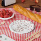 Des assiettes de fête de 50 ans avec des confettis en or rose.