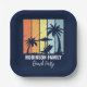 Plaques de papier de fête marine bleue plage personnalisées pour votre voyage en famille à Hawaii, en Floride, ou d'autres destinations d'île tropicale. Les palmiers cool se dressent contre les couleurs rétro de l'orange et du jaune au-dessus de votre nom de vacances customisé en écriture blanche. Idéal pour un groupe qui part en croisière ou en escapade côtière.