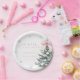 Celebrate in style with these personalized plates snowy pine trees and pink bows. Perfect for a Winter Onederland themed first birthday.