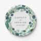 Cette assiette en papier de réception de mariage avec couronne de verdure luxuriante est parfaite pour un mariage élégant dans le jardin. Le design botanique moderne présente de beaux eucalyptus bleus aquarelle et des feuilles vertes. Ces assiettes en papier jetables sont parfaites pour la table de gâteau ou de dessert. Personnalisez-les avec les noms des mariés et la date du mariage.