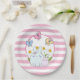 Plaques en papier avec un arrière - plan rayé rose et blanc. Un cadre circulaire blanc avec une bordure rose superposée. A l'intérieur du cadre une illustration d'une mère et un bébé lapin debout ensemble. Bouches jaunes dans l'arrière - plan. Des papillons géants.