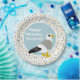 Créez des fournitures personnalisées pour les fêtes d'anniversaire et autres événements spéciaux. Ces plaques en papier présentent l'illustration d'une mouette, une bordure d'impression festive de confettis et votre message en caractères gras blancs contre un arrière - plan bleu clair.