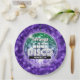 Assiettes en papier pour la dernière soirée disco avant le mariage parfaites pour des soirées disco entre filles, avec un fond scintillant violet et un ballon disco miroir violet et sarcelle. Personnalisez avec le nom de la future mariée et la ville de sa dernière soirée disco.