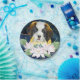 Plaque en papier élégante et unique avec adorable chiot de chien St.Bernard, fleurs et faux confetti doré sur élégant arrière - plan foncé.