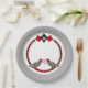 Ces plaques de papier amusantes présentent le design original de Leslie Sigal Javorek qui débute avec un Motif de diamant rétro rouge et noir des années 1950 en cercle ; au fond, une paire d'oiseaux de tissu rouge et gris se font face tout en grignotant sur une paire de vers rouges comiques, formant un coeur. Le faire tomber est un champ personnalisé pour votre monogramme !