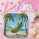 Grand cornichon vert accroché entre deux palmiers tropicaux sur une plage aux tongs.