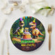 Dino quatre dinosaures coloré fête d'anniversaire vaisselle personnalisée modèle assiettes de fête, dinosaures portant casquettes de fête avec un gâteau d'anniversaire dinosaure plaques d'anniversaire