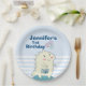 Plaques en papier d'anniversaire avec un mignon dinosaure souriant, joues roses et RAWR écrit sur son ventre. 3 étoiles joyeuses et colorées au-dessus de sa tête. Placé sur un motif bleu clair et blanc de pois et rayures.