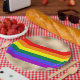 Ces assiettes de fête colorées présentent un thème LGBTQ Pride. Le drapeau rayé rainbow Pride couvre les parties inférieures de la boîte. Un motif en feuille d'or couvre la partie supérieure.