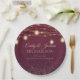 Plaques en papier mariage dans un élégant bordeaux avec parties scintillant dorée, lampes à cordes et lanternes. Personnalisez avec les noms du couple, la date du mariage et l'emplacement.