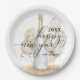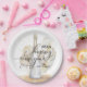 Stylish Happy New Year party paper plates feature a watercolor champagne bottle with gold and white balloons and your details in chic lettering.