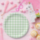 Modifiez la couleur vert pâle de l'arrière - plan derrière la tuile sans couture en vichy à damiers motif. Ajoutez du texte pour créer vos propres plaques de papier personnalisées. La motif traditionnelle en vichy ajoute une touche de charme et de nostalgie à tout événement spécial. Ces assiettes sont idéales pour un baby shower, un pique-nique familial, des barbecues ou tout rassemblement extérieur où l'on souhaite une atmosphère décontractée et joyeuse. Ils peuvent également être intégrés à un mariage vintage ou d'inspiration nationale.