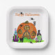 Plats en papier Halloween amusants pour un enfant La fête d'Halloween présente une grande maison de gnome citrouille et deux gnomes debout de part et d'autre. Il y a aussi un chat noir et des araignées noires. Il dit Happy Halloween en haut. Ce design est également présenté sur toute une collection d'approvisionnement de fête, alors assurez-vous de jeter un oeil à tous les articles amusants.