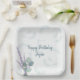 Plaques de papier fête d'anniversaire avec thème nature. Eucalyptus et fleurs de lavande design avec texte au centre. Les assiettes blanches carrés sont de deux tailles, ou choisissez la forme ronde. Un léger arrière - plan de feuilles et de tiges recouvre l'assiette d'une branche de lavande et d'eucalyptus gris-bleu dans le coin. Le design sobre et sobre est parfait pour célébrer une journée spéciale pour les amoureux de la nature. À utiliser lors d'une fête d'anniversaire à domicile pour un parent ou au bureau pour un collègue de travail.