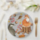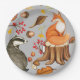 Les assiettes de fête en papier à thème des bois d'automne comprennent du renard et du blaireau avec des feuilles, des baies, des champignons et des glands sur arrière - plan gris clair.
