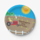 Produits pour la fête d'anniversaire pour enfants avec des images de couleur vive d'un fermier dans son tracteur qui s'occupe de sa ferme par un jour ensoleillé. Personnalisé avec le nom de votre enfant dans le champ fraîchement labouré.