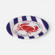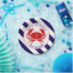 Plaques de fête d'anniversaire avec un thème nautique avec l'illustration d'un crabe et d'un arrière - plan rayé bleu et blanc. Personnalisez le texte. Des serviettes de toilette, des invitations et bien d'autres encore sont disponibles à Jill's Paperie.