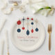 Cute retro Joyeuses plaques de papier fête de Noël avec des ornements de style 70 vintages en rouge, bleu et ivoire au-dessus de votre nom de famille. Beau décor de vacances nostalgique pour vos dîners.
