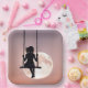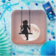Silhouette fille sur une balançoire avec une pleine lune dans un ciel rose.