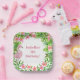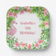 Ces plaques de papier amusantes pour la fête d'anniversaire de la fille ont un thème flamand rose. L'aquarelle est une végétation tropicale luxuriante avec des fleurs roses et un flamant rose comme bordure. Personnalisez ces assiettes en papier de fête avec le nom de l'enfant.