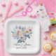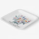 Une élégante assiette en papier carrée à fleurs blanches pour dîner de répétition ou fête de mariage