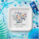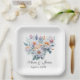 Une élégante assiette en papier carré à fleurs blanches pour dîner de répétition ou douche de mariage