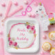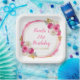 Belle assiette de fête d'anniversaire avec un cadre de parties scintillant rose et or chaud avec des arrangements floraux. Les mots peuvent être changés en fonction de vos propres détails ou exigences