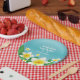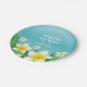Cette plaque de papier à thème mariage tropicale présente des fleurs de frangipani blanc et jaune illustrées de Destei et des feuilles verts. La couleur de l'arrière - plan est bleue et il y a des zones de texte personnalisables pour la date du mariage et pour les noms du couple qui se marie.
