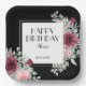 Cette élégante plaque en papier d'anniversaire à la flore heureuse présente une fleur rose bordeaux avec des feuilles et un agencement verdoyant sur fond noir.