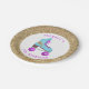 Plaques de papier pour fêtes d'anniversaire amusantes pour une soirée à thème de patinage à rouleaux avec une ambiance vintage. Il y a une illustration dessinée à la main d'un patinage à rouleaux de couleurs rose et bleue avec une fausse parties scintillant d'or en forme de foudre imprimé dessus. Customisez ce produit en ajoutant le nom et l'âge de votre enfant.