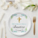 Dé la bienvenida a sus invitados al bautizo de su bebé con estos bonitos platos de papel para bautizo. Este neño présenta elegantes flores azules con una cruz de oro.
