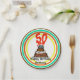 Joyeux 50e anniversaire - fournitures de fête personnalisées, décorations de fête, articles de fête d'anniversaire. Un gâteau d'anniversaire au chocolat à trois niveaux au feu avec des bougies de 50 ans. Personnalisez le message d'anniversaire et le nom de la personne d'anniversaire. Combinaison de couleurs rétro turquoise, orange, jaune et marron pour cette ambiance des années 1970.