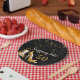 Entrée dans 50 Gold Foil Confetti et chaussures 50th Birthday Party Plates. Les assiettes de fête d'anniversaire de cette femme moderne et élégante sont parfaites pour une Fête du Cinquante Anniversaire. Les assiettes comprennent des chaussures en or, des confettis en feuille dorée, des arrière - plans damassés noirs et des typographies en écriture blanche. Veuillez contacter le concepteur pour customiser les articles correspondants.