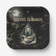 Bouteille de maison gothique Hantée Hantée Halloween Plaques de papier costume de fête Halloween. Ces assiettes de fête présentent un design gothique foncé avec un arrière - plan noir brumeux. Des accents dorés rustiques ornés encadrent la carte, tandis que le titre de l'événement, "Haunted Halloween" est affiché dans un étrange script gothique doré. L'image subtile d'une sorcière éffrayante mélangeant sa potion magique et une pleine lune renforce l'atmosphère étrange.
