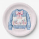 Cette assiette de fête de Noël a un pull de Noël bleu et rose avec un arc rose.