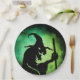 Plaque en papier avec une silhouette noire d'une sorcière ancienne qui agite un chaudron sur un arrière - plan noir et vert.