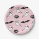 Plaque papier Halloween rose et noir avec arrière - plan rose clair, mignon fantôme Kawaii, texte BOO et chauves-souris noires.