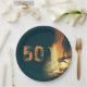 Plaques de papier de fête d'anniversaire Bonfire. Couleur bleu turquoise foncé avec une image de feu brûlant et un endroit pour l'âge.