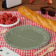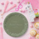 De belles assiettes en papier vert sauge foncé continuent le thème romantique dans cette suite de douche nuptiale. La typographie est élégante, mais joueuse et moderne. Les couleurs sont douces et bohèmes dans toute la fête. Les petites assiettes légères fonctionnent parfaitement au-dessus des grandes assiettes sombres.