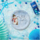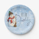 Cette plaque en papier mignon, design de Noël en bleu, présente des flocons de neige étincelants comme toile de fond pour un gros bonhomme de neige et le texte manuscrit "Let's be Jolly".
