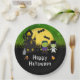 Cette assiette amusante et éffrayante présente de mignons monstres Frankenstein à côté d'une maison hantée. Dans l'arrière - plan est une pleine lune avec des chauves-souris et un ciel de nuit vert avec des étoiles. C'est parfait pour une fête d'Halloween.