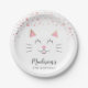 Plaque de papier de fête pour la fête d'anniversaire du chat de votre enfant. Il y a le visage d'un chaton avec des bulles de parties scintillant roses. Customisez ce produit en ajoutant le nom et l'âge de votre enfant au bas. Idéal pour une fête d'anniversaire avec design rose et or.